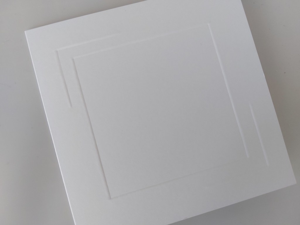 I started by using the smallest square of Clarity’s plastic embedders to create the frame for the scene. I attached the embedder to the front of a 5×5 card with a bit of low tack tape, then ran an embossing tool around it from the inside of the card. I repositioned it so it was off-set and added an additional partial frame at the top left corner, then repeated that at the bottom right.