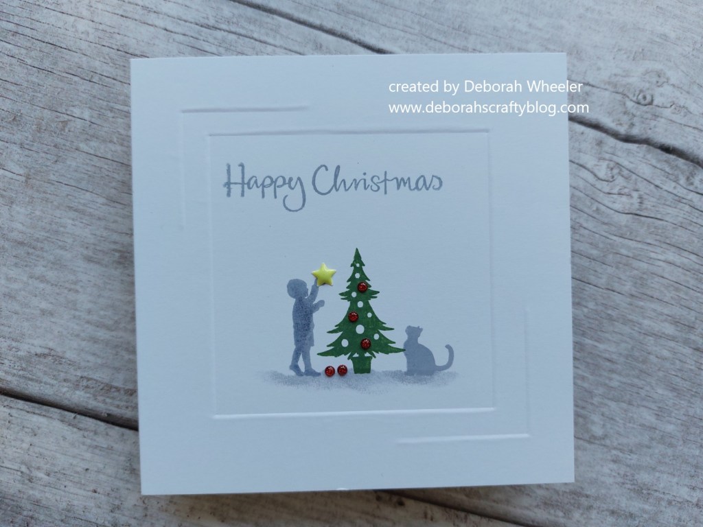 I grounded the scene by sponging the ‘shadow grey’ across a torn piece of copy paper, and stamped the sentiment at the top. I then added a few sparkly Glossies onto the tree, with a few more on the floor waiting for the boy to add them once he’s finished getting the star on the top.