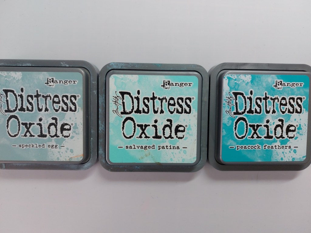 My friends won’t be surprised to see that this card features shades of teal! I’ve used 3 Distress Oxides, in ‘speckled egg’, ‘salvaged patina’ & ‘peacock feathers.
