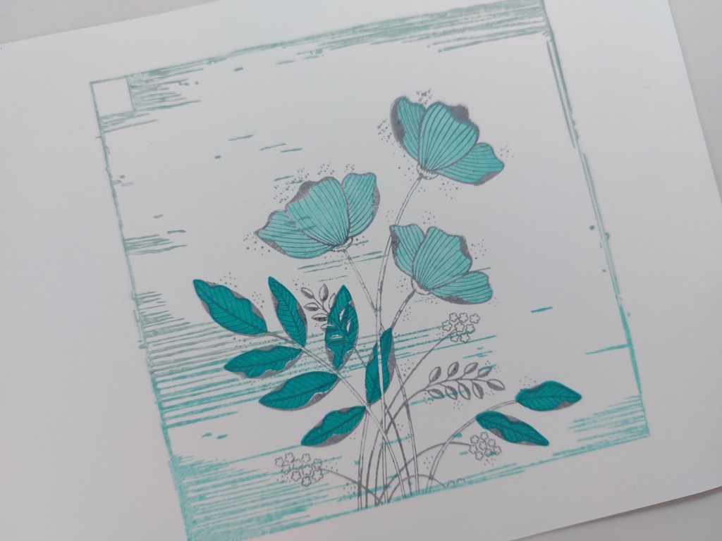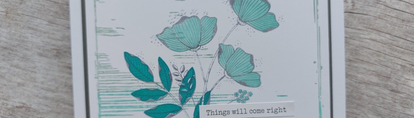 I masked off the lower edge of the background with a strip of low tack tape and then stamped ‘Tina’s floral spray’ from Clarity onto the card using ‘shadow grey’ Archival ink. Regluar readers of this little blog will know this is one of my all-time favourite images! I used the infill stamps from the set to colour the flowers with ‘salvaged patina’ and the leaves with ‘peacock feathers’.