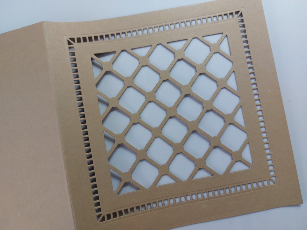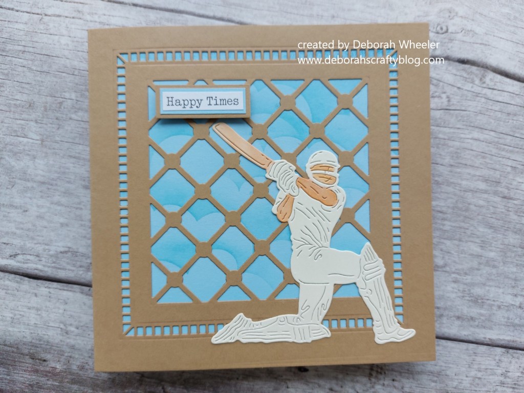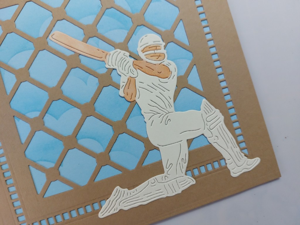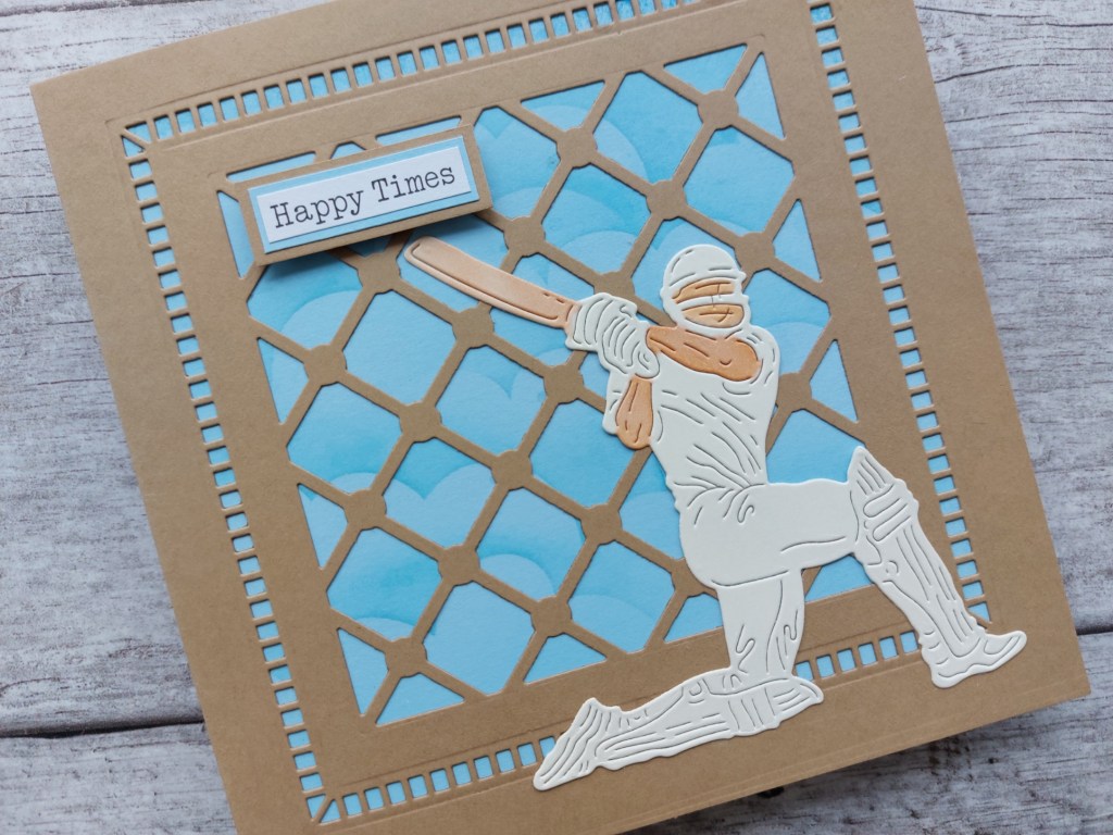 My son wanted a birthday card for his father, who is a very keen cricketer, so I thought that fitted the bill perfectly. I started by cutting the ‘lattice pattern’ die from Claritystamp into the front of a 6×6 kraft card blank, then added one of their ‘frame-it’ dies to cut the border. the lattice work made me think of the practice nets used for cricket training.