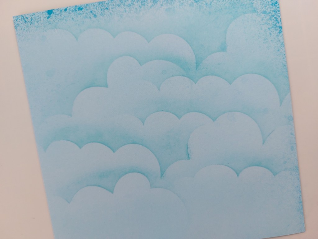 I found a piece of pale blue designer paper my Clarity stash, and added clouds to it with the mask and ‘tumbled glass’ Distress ink.