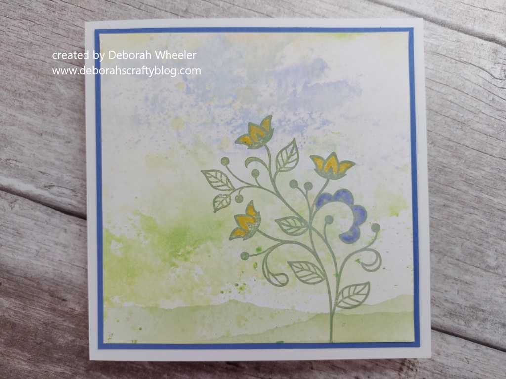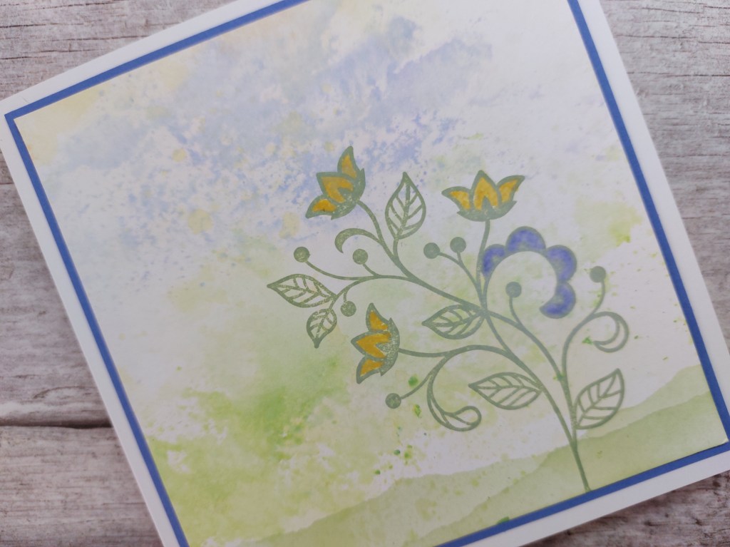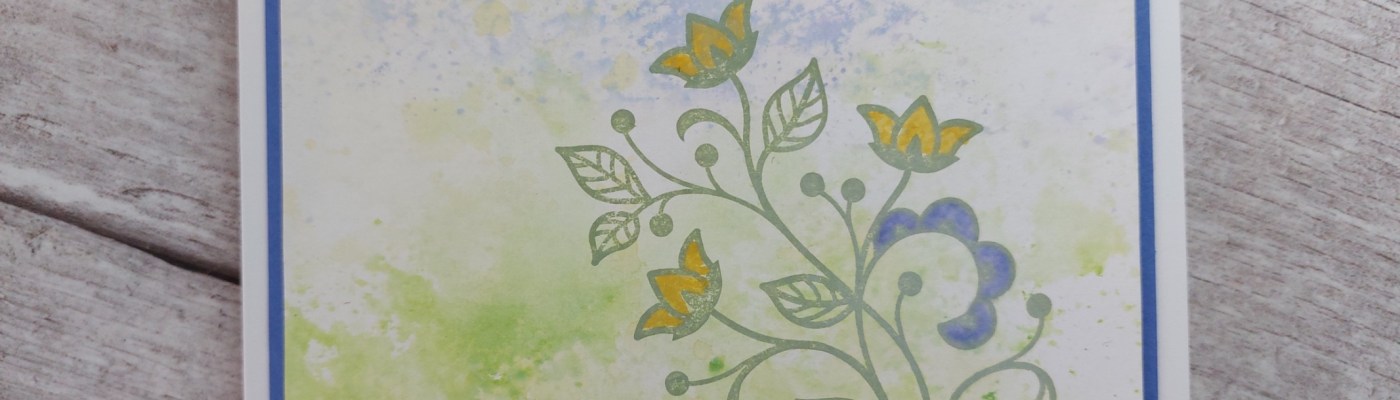 Welcome to my crafty blog and another throwback with a retired Stampin’ Up! set – ‘flourishing phrases’. I’ve always liked this floral spray from it, which I thought would sit well on one of my inky backgrounds (haven’t used one of those for a while). I had to get one out after I saw the theme over at Time Out, and added in the palette from Colour INKspiration.