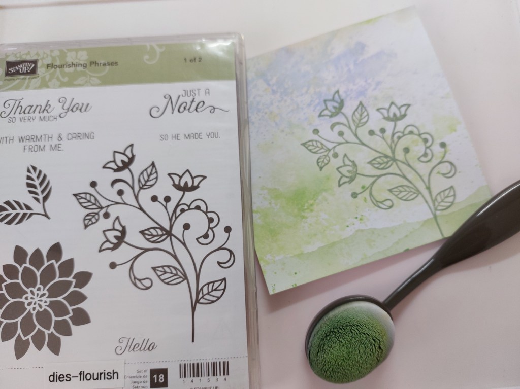 I then stamped the floral spray using ‘pear pizzazz’ (the Write markers are great for inking up stamps), and used a blending brush with torn copy paper to create some hills across the bottom of the card.