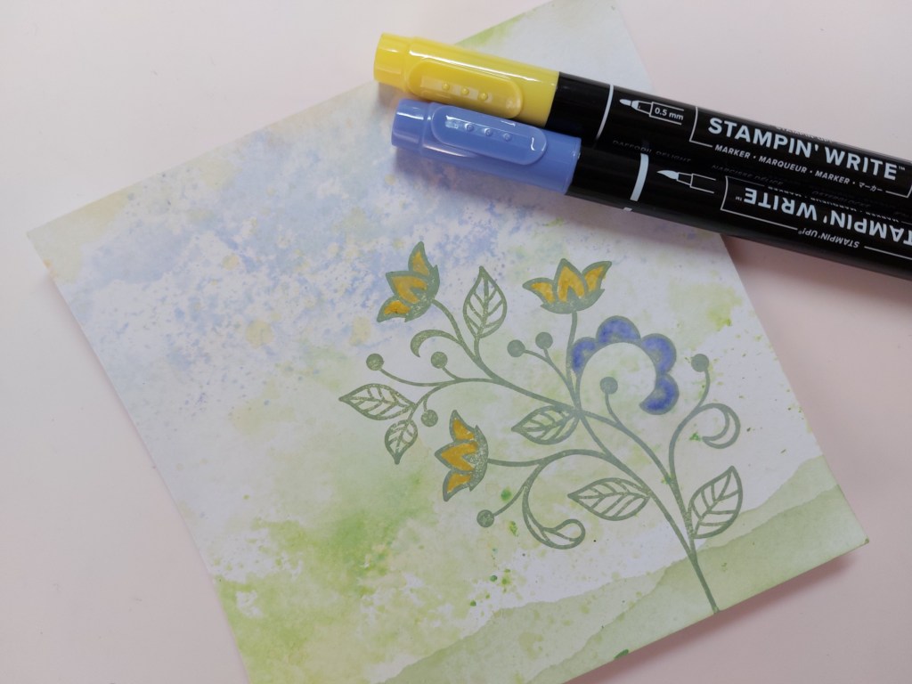 I shaded parts of the floral spray with a couple of Write markers in the ‘daffodil yellow’ & ‘orchid oasis’. The orchid was very vibrant (it’s a new pen), so I used a damp piece of kitchen towel to blot the ink and lift a little off (stencil card copes well with a bit of water).