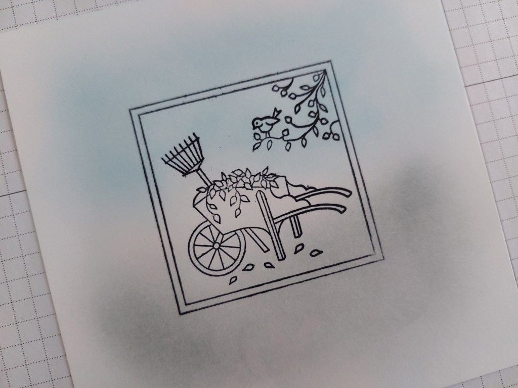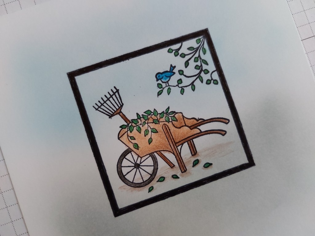 I then used Clarity’s Pergaliner pencils to colour the image, adding some more shadow below the wheelbarrow as well with a brown pencil. I filled in the frame as well using a black micron pen.