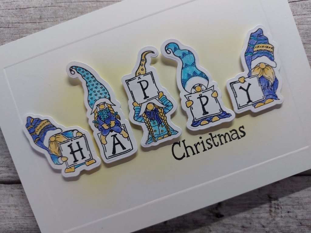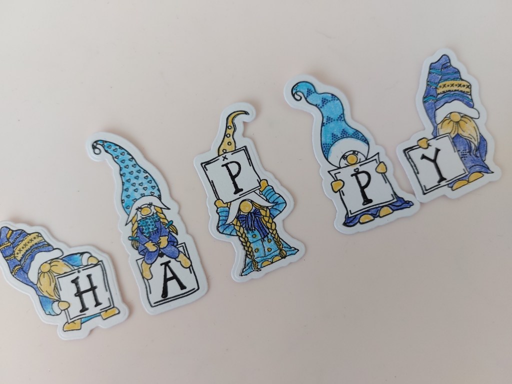 I stamped out five of the little letterbox gnomes (there are 9 in the set) onto white card and coloured them using Pergaliner pencils in mustard, navy and turquoise, before die cutting them. I then stamped the letters for ‘happy’ into the letterboxes, using the Alphabet set that’s part of the gnome collection.
