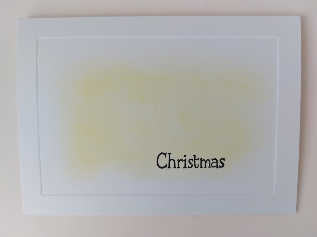 I started with a 5×7 card blank and embossed a frame onto it with one of Clarity’s embedders (I talked about how to do this in my ‘ladybirds’ post a few days ago). I then blended ‘mustard seed’ Distress Oxide into the centre of the frame and stamped ‘Christmas’ across the lower part using black Versafine Clair ink (my new favourite!)