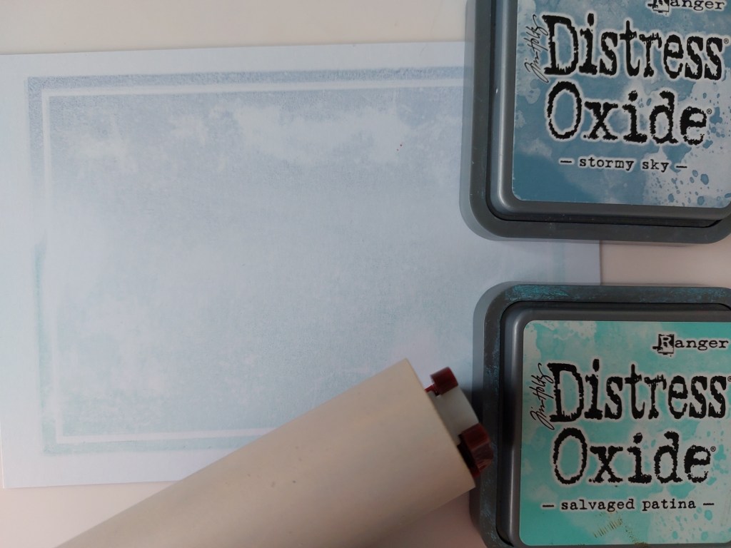 I started by creating the background with the large rectangle backdrop stamp. I brayered ‘salvaged patina’ & ‘stormy sky’ Distress Oxides onto the stamp then put it onto a piece of white card that I’d cut to fit a 5×7 card blank. You can see that it didn’t stamp fully across the top (not sure why), but I went with it as I thought the white areas looked like clouds.