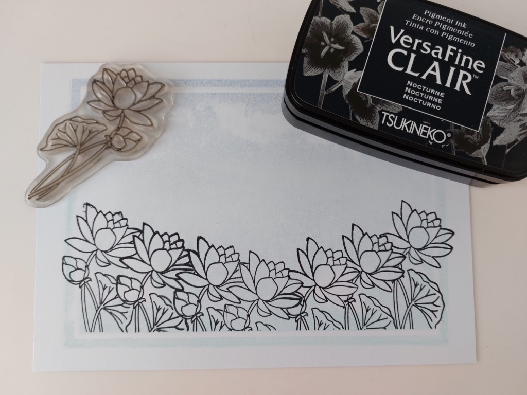 I then repeat stamped the larger of the lotus flowers across the lower edge of the stamped background. I ran a piece of low tack tape along the edge before starting and stamped the centre flower first. I cut a mask for that from an all-over sticky note and covered it before stamping the next two, one on either side. I carried on masking & stamping until I’d got the whole row of flowers in place.