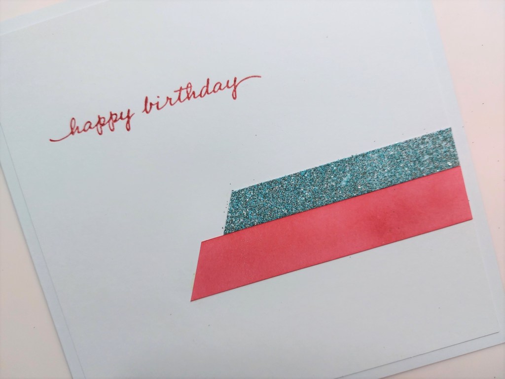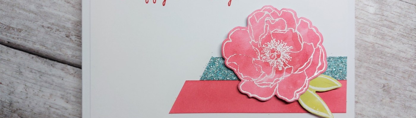 I started with a couple of strips of white card from my scraps box. I blended ‘cranberry’ Adirondack ink onto one of them and heat embossed the other with WOW’s ‘aquamarine’ powder. I trimmed them both at an angle and glued onto a piece of card to fit a 6×6 card blank. I stamped the sentiment in place using the ‘cranberry’ ink and attached the topper to the card blank.