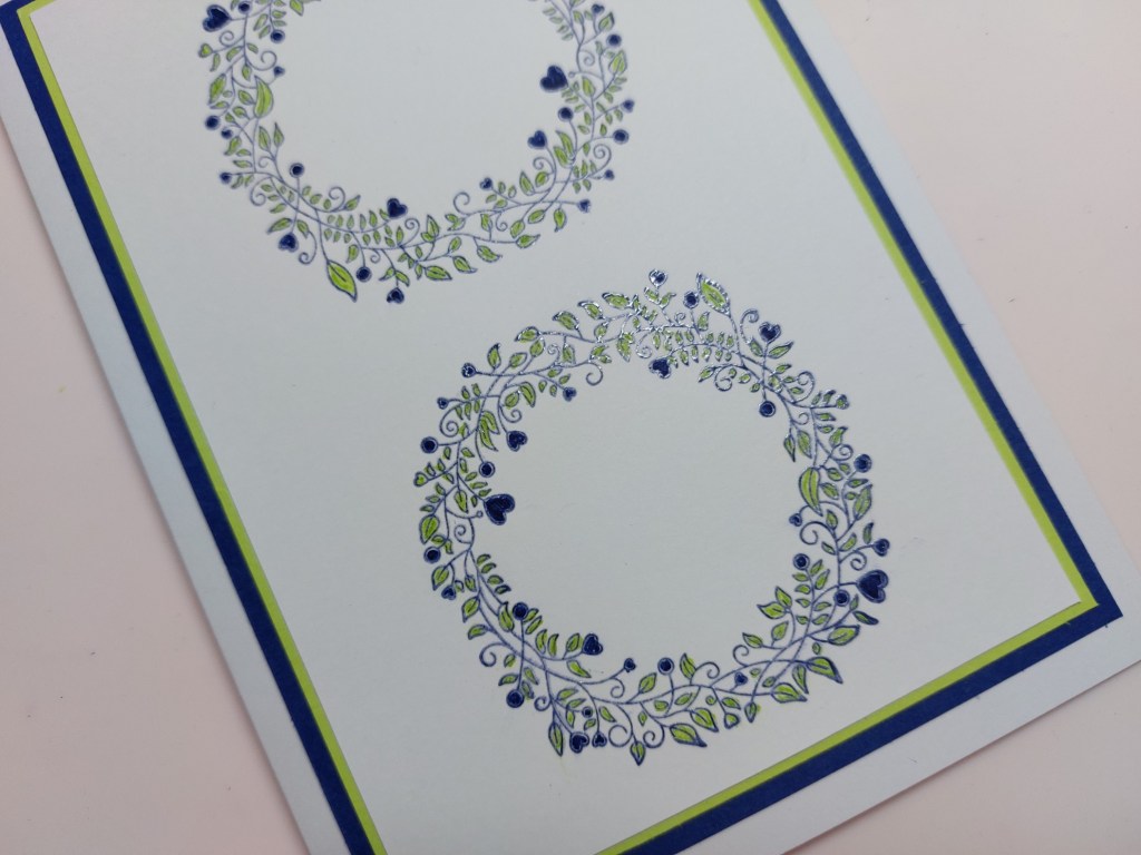 I need to make a couple of anniversary cards for friends, so thought this would give me a good start – there are lots of little hearts tucked into the wreath. The first step was to stamp it twice on a rectangle of card – I used ‘chipped sapphire’ Distress Oxide, then heat embossed the images with clear powder.