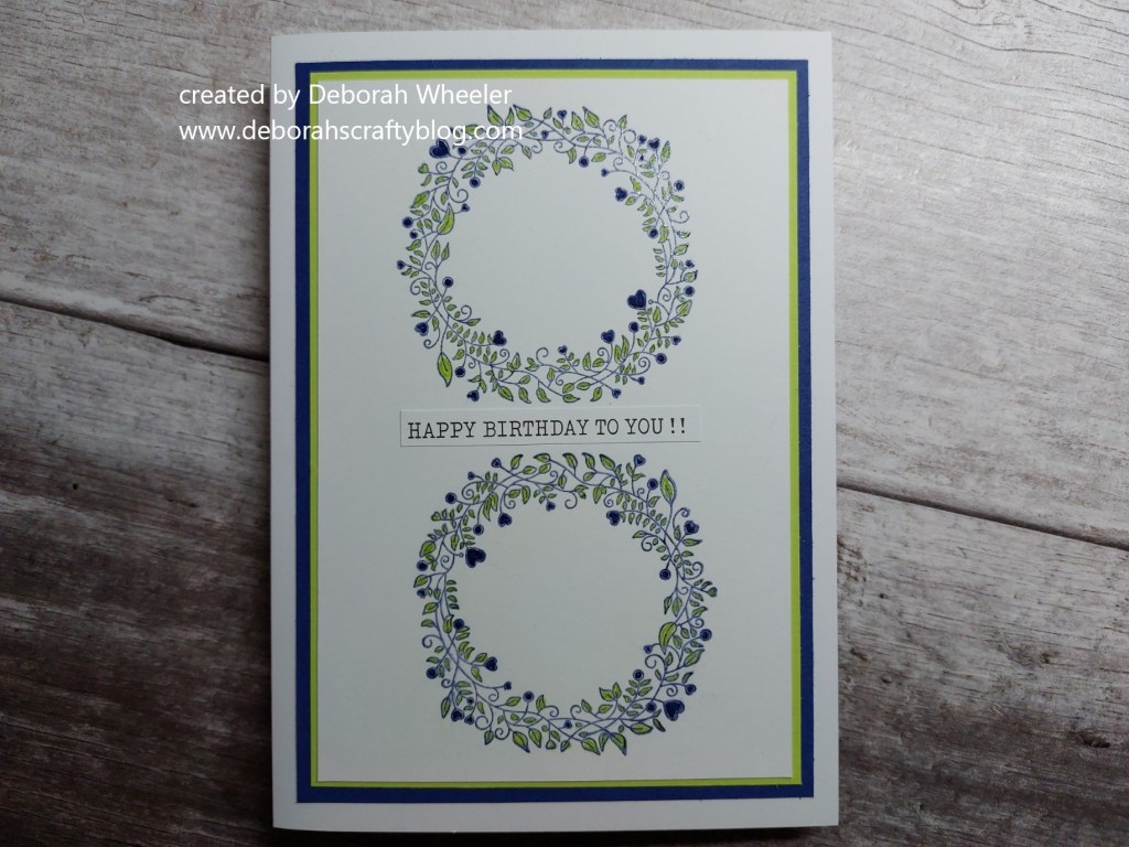 So I’ve combined a few challenges in this card as well. I took the sketch from Fusion for my layout and picked up the theme of ‘repetition’ from Inkspirational with the two wreaths and the sentiment. I also took the colours from the linked challenges at Color Hues and Seize the Birthday – as I was using my stamping platform for this one, I made two cards at the same time so I’ve also got another birthday card for one of my September friends!
