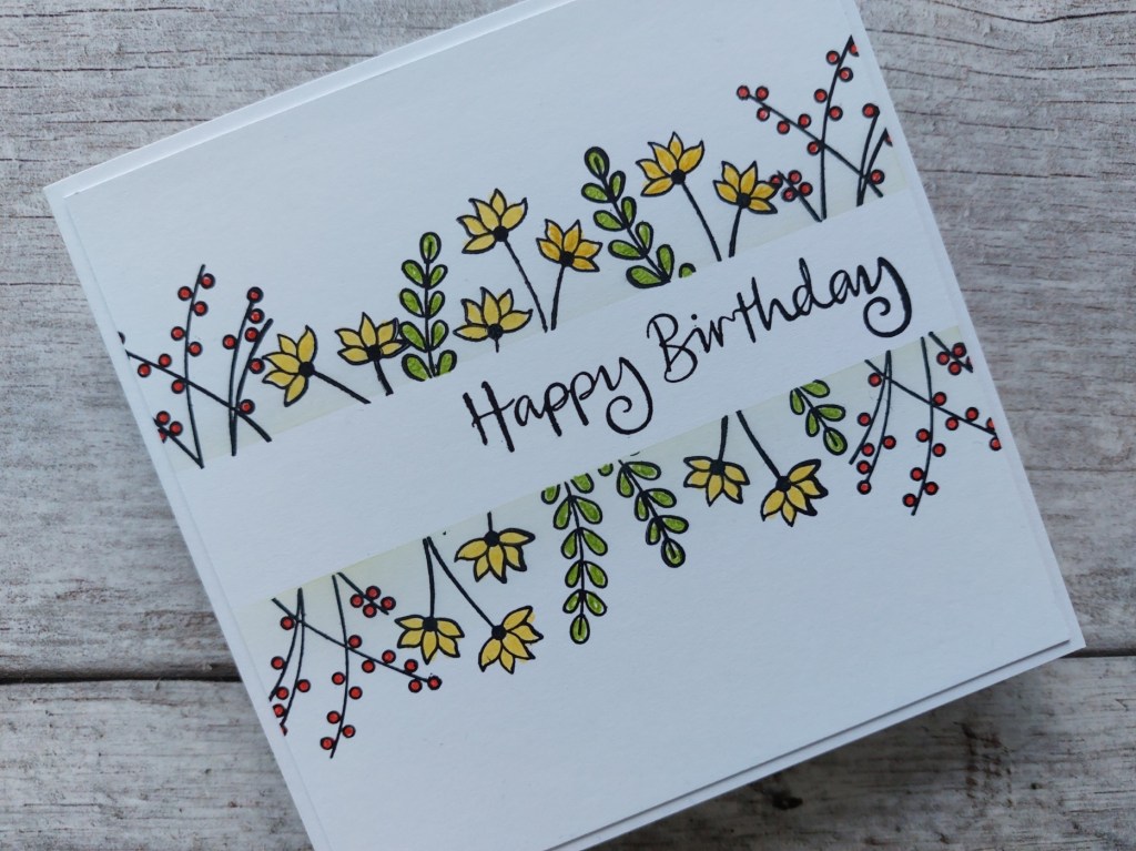I had to change the masking tape, as it had black ink on it and I didn’t want to smudge the next step (should have thought this through and done this step first!). Once the new tape was in place I lightly brushed ‘bundled sage’ Distress Oxide along both edges, which subtly highlighted the panel across the centre. I stamped the sentiment in black ink and attached the topper to a 5×5 card blank.