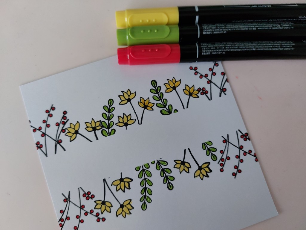 As I usually do, I started with a square of white card. I ran a piece of masking tape across the centre and then repeat stamped the three images along both sides of the tape with black \versafine Clair ink. I then used SU marker pens to colour them in red, yellow & green.