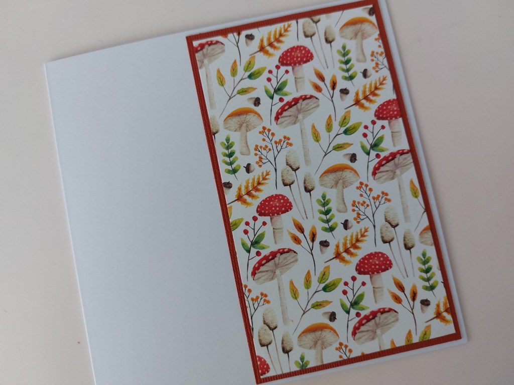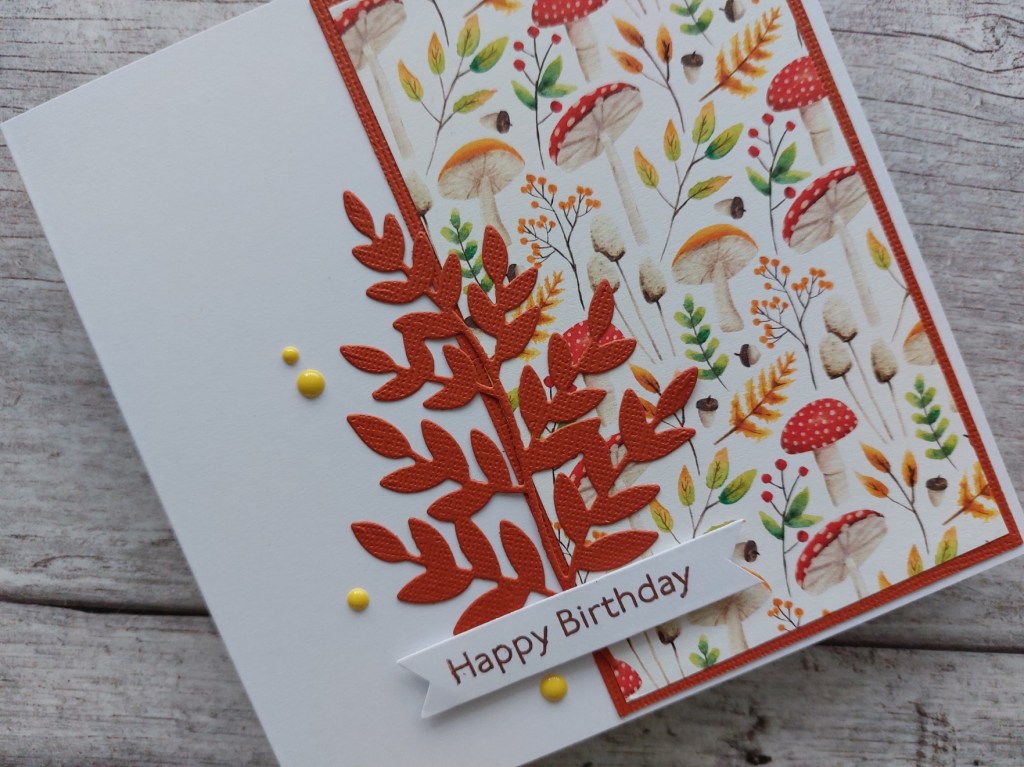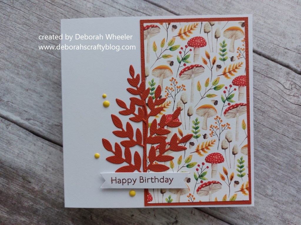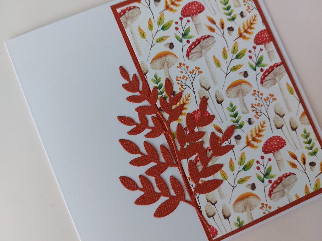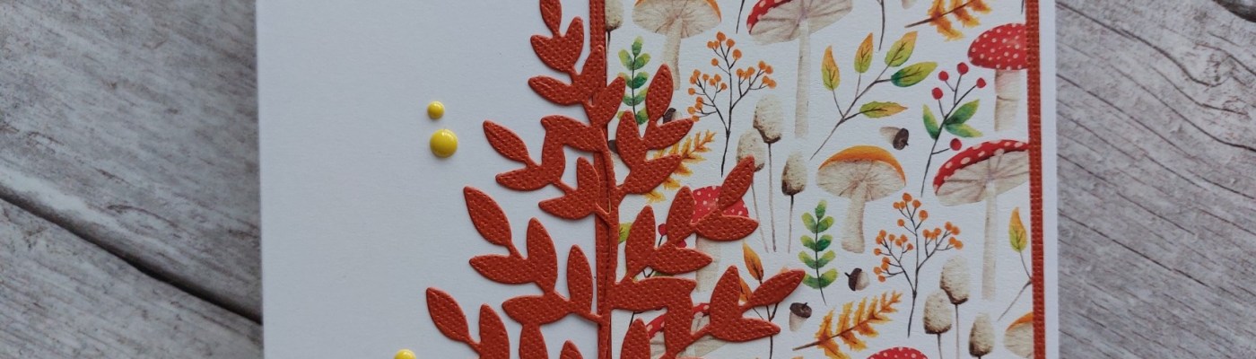 I had to rack my brains for this one as I don’t have any stamps with mushrooms or toadstool, but then I remembered a couple of pieces of an old Stampin’ Up! toadstool patterned paper sitting in my stash which were just perfect. I trimmed a piece down, layered it onto a piece of rust coloured card and attached them to a 6×6 card blank.