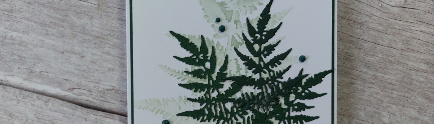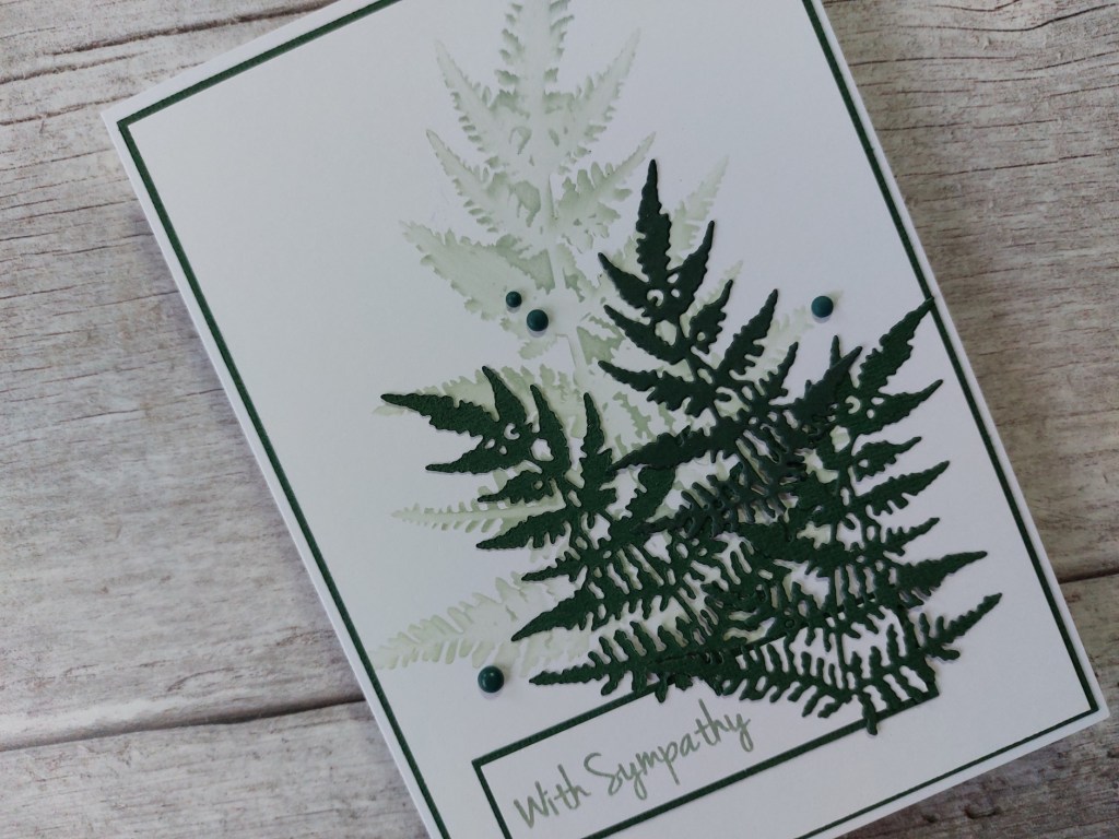 I cut three ferns with the middle sized die in the set, again in the dark green card, and attached those to the card front, flowing over the panel with the sentiment, then finished with a few dark green resin dots.