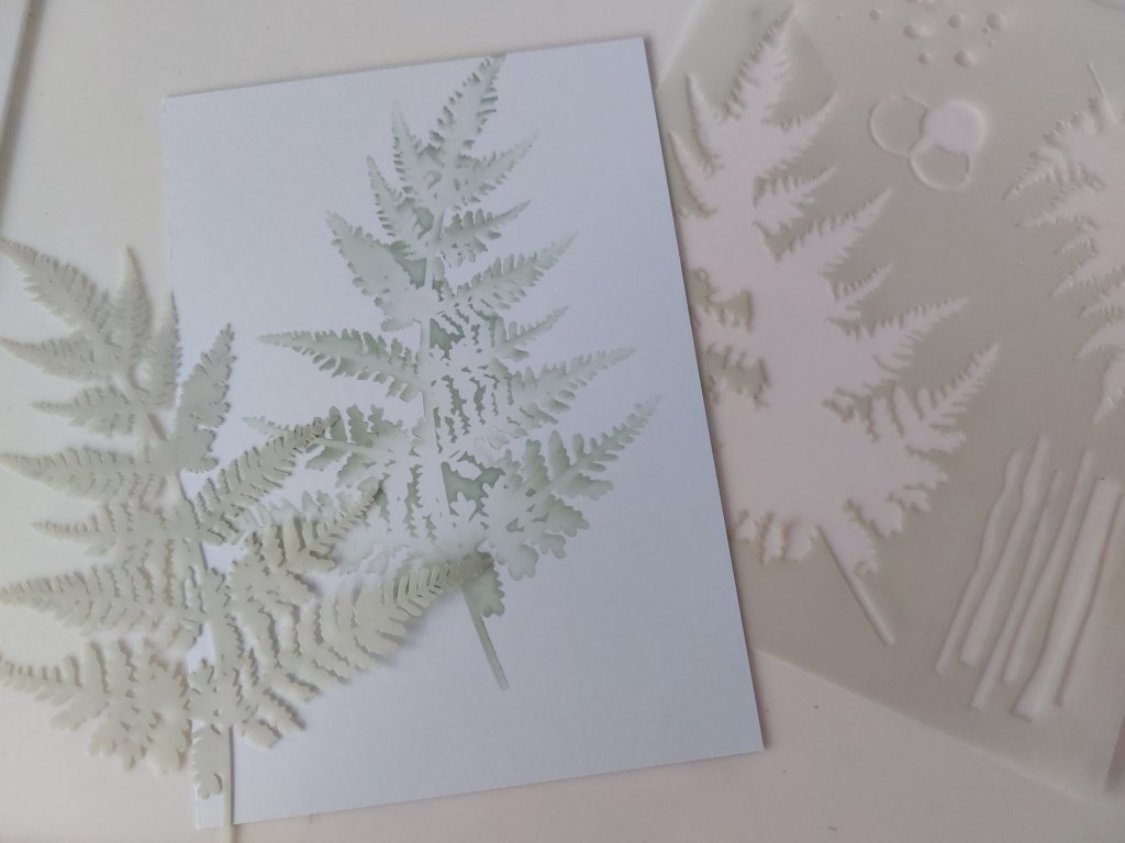 I started by stencilling the large fern onto a piece of white card using a blending brush and ‘iced spruce’ Distress Oxide. I used the outline stencil first to created the overall shape of the fern, then slotted the ‘innie’ fern back into the outer piece as a mask, so that I could blend more ink through that to give me the detail on the fern. A great tip from Hazel!