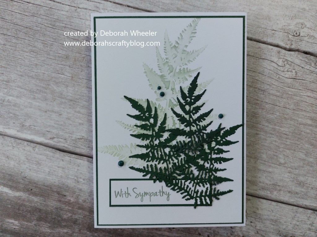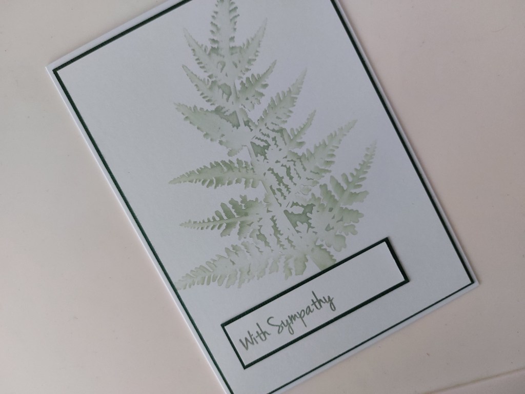 Hello there. I’ve got a sympathy card to share with you today, using the ferns stencil & dies designed by Hazel Eaton for Julie Hickey Designs. I’ve actually used a technique I picked up from Hazel with the fern stencil as well, thanks to the current challenge at Just Add Ink (I’ve used foliage & masking), but more of that in a minute. I also picked up the layout from Freshly Made Sketches as a last minute entry!