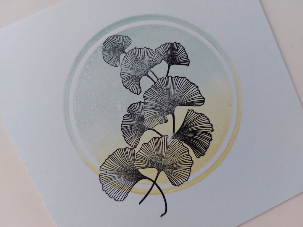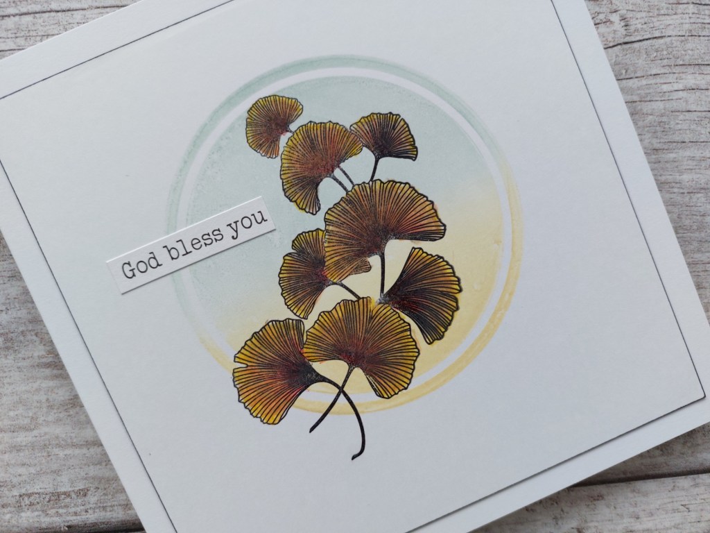 I then stamped Clarity’s A6 ginko leaves over it, using black Archival ink.