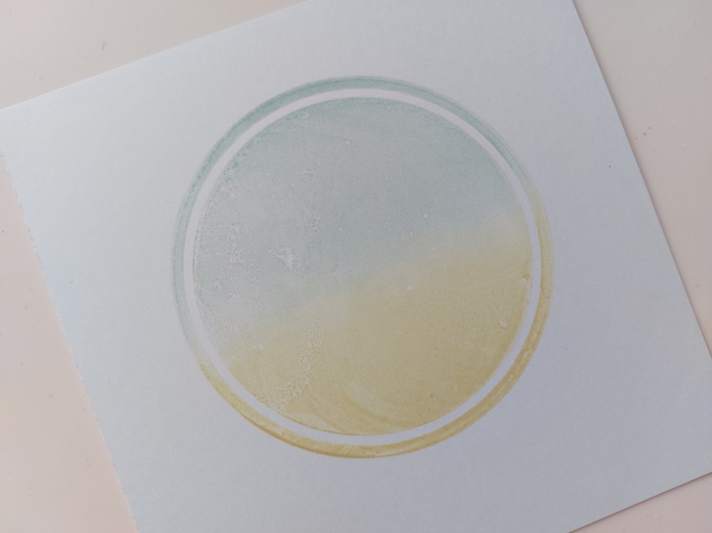 I started with the small round backdrop stamp from Clarity, using my brayer to blend Distress Oxides in ‘specked egg’ and ‘antique linen’ onto it.