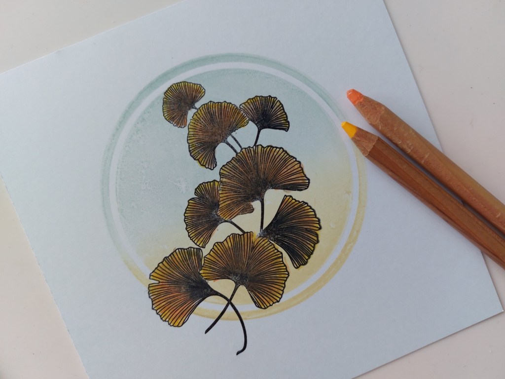 Rather than used the infill stamps in the set to colour the leaves, I opted to shade them with Pergaliner pencils in two shades of orange. I did check this out – ginko leaves turn orange and yellow in the autumn before dropping from the plant, so it’s all good!