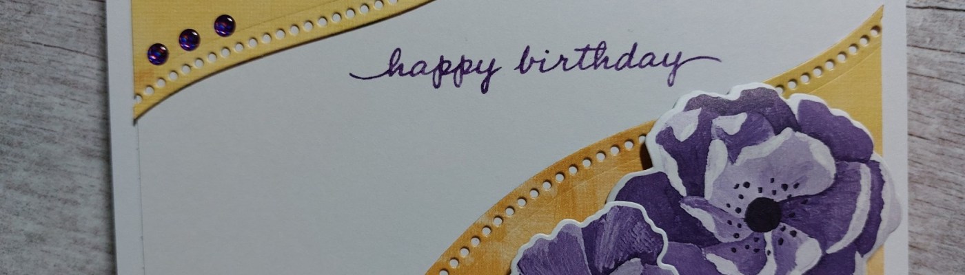 I stamped the sentiment from ‘happiness abounds’ across the centre of the card. One of the great things about this set is that the dies will cut out some of the images from the paper – I chose two purple flowers to die cut and attached them to the card front with foam pads (I used a bone folder to bend the paper first, so they had a little more dimension). A trio of resin dots completed the card.