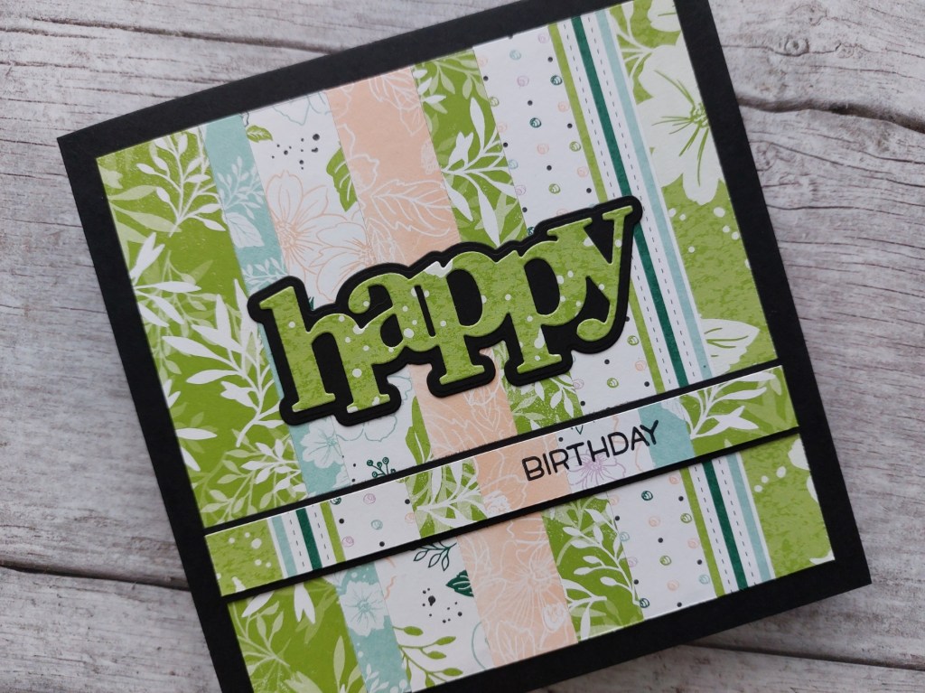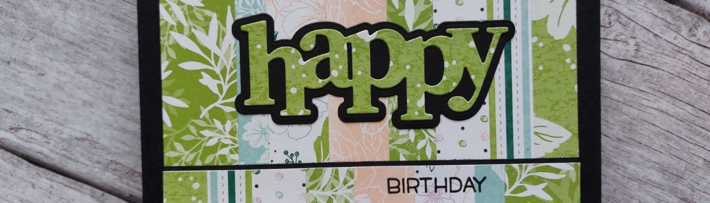 I cut Julie Hickey’s ‘happy profile’ die, using black for the background and a piece of the green DSP for the word, glued them together and then onto the card. I finished by stamping ‘birthday’ across the rotated strip in black Versafine Clair ink.