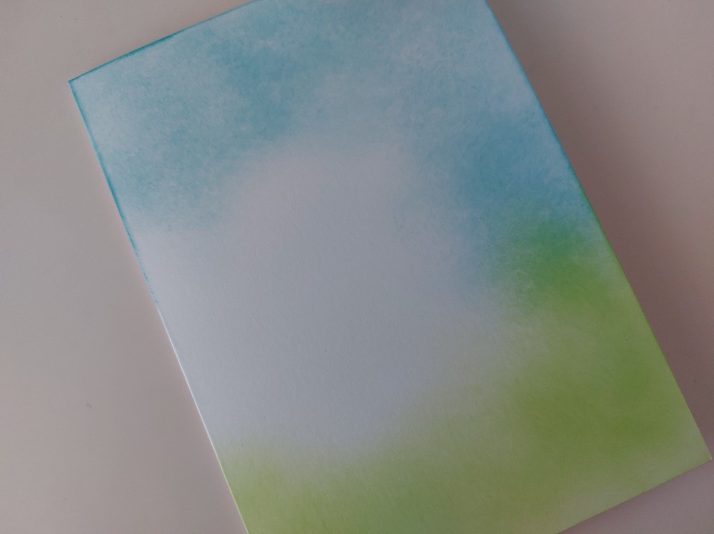 It took me a little while to decide what to do with the background on the card, and in the end I blended ‘broken china’ & ‘mowed lawn’ onto the card front, to follow the landscape theme. I quite the effect as the card is not completely smooth.