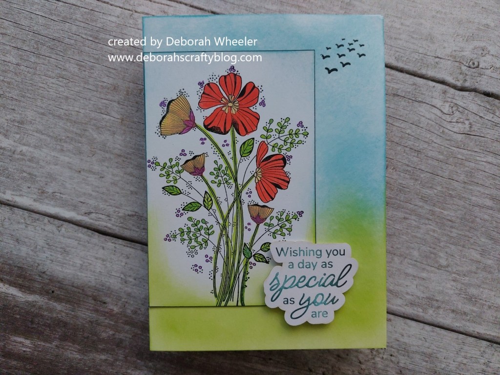 Welcome to my crafty blog. I’d planned to share this card yesterday, but ran out of hours in my day so here it is now! I thought of this ‘wildflower spray’ stamp from Clarity when I saw the inspiration photo from Just Add Ink and have teamed it with the sketch from TGIF challenges. I’ll also share it with Happy Little Stampers as I watercoloured the flowers with inks.