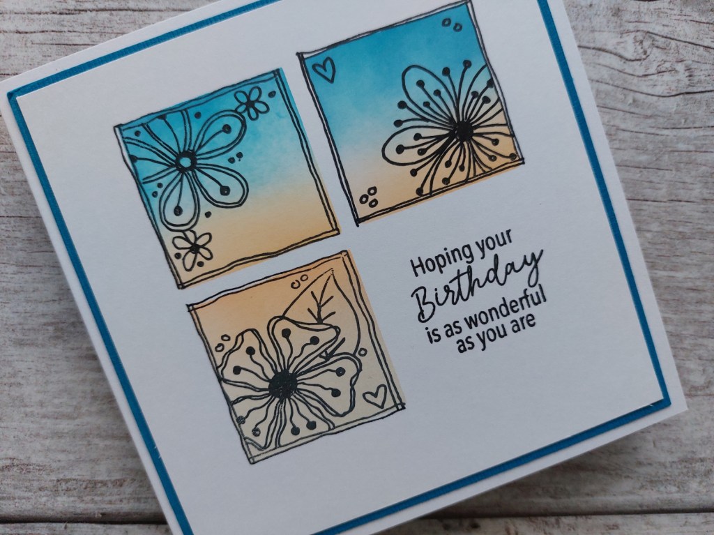 I finished by adding one of the sentiments from Julie’s ‘positive wishes’, added a mount of blue card and attached the whole piece to a 5×5 card blank.