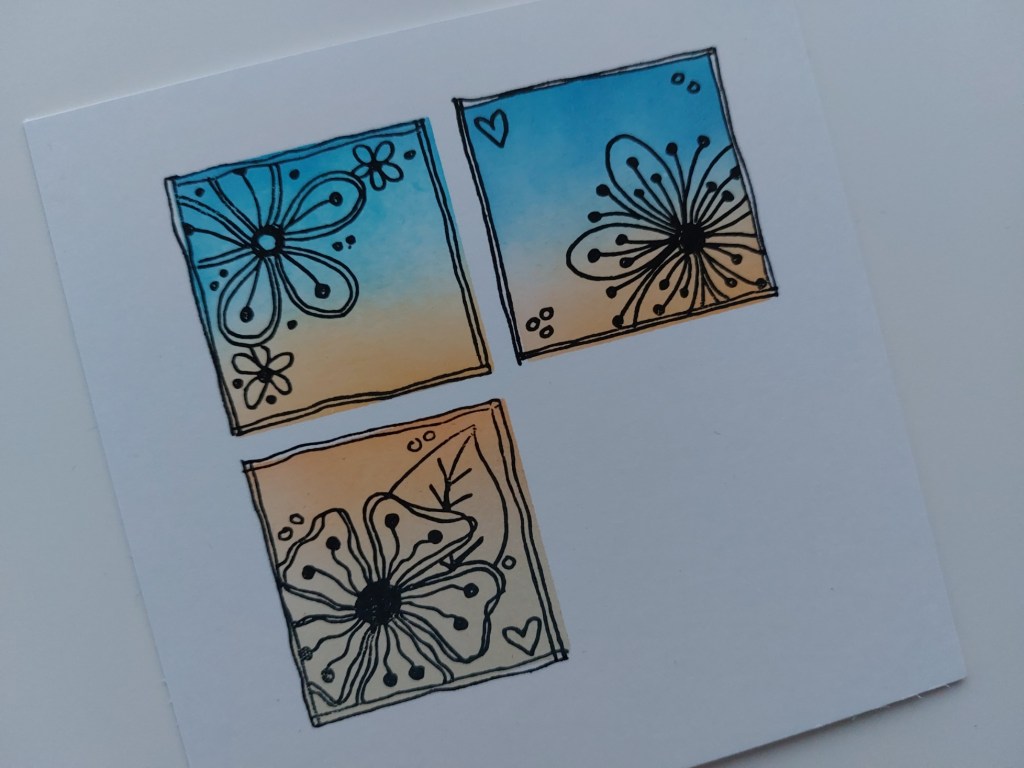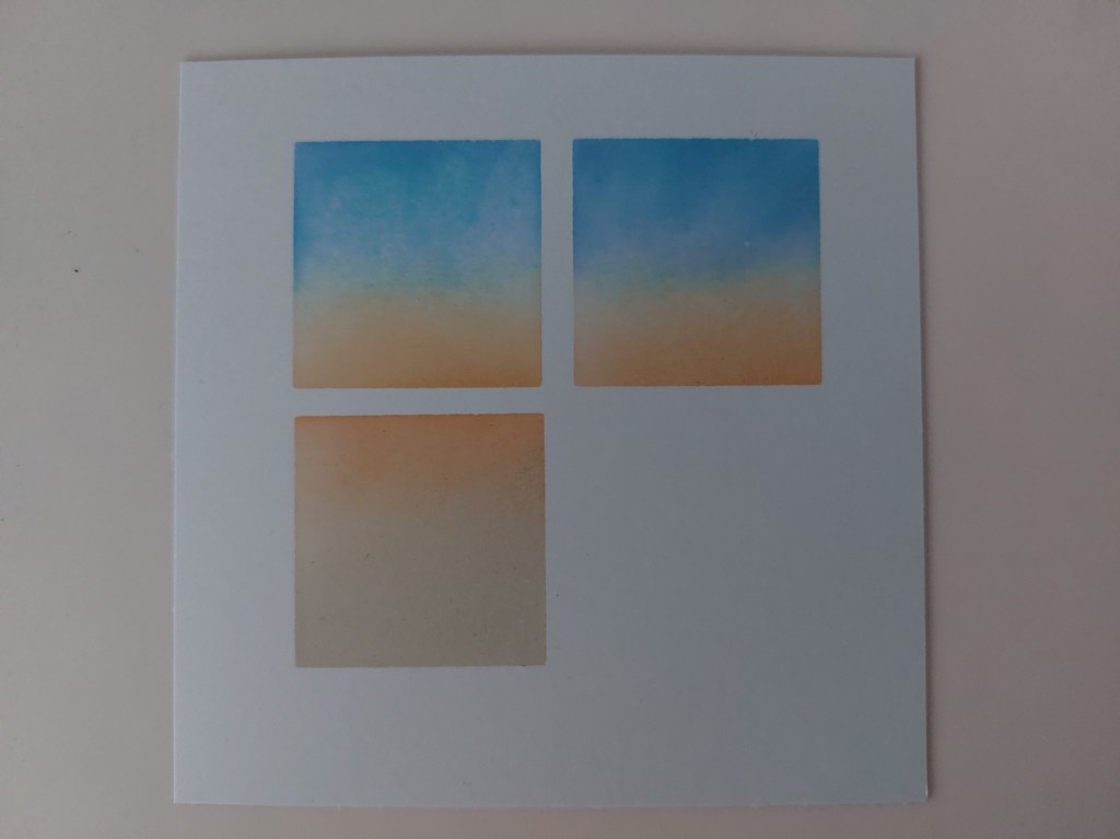 I started with the outer part of a mask that I’d cut using a small square nested die and blended Distress Oxides through it, repeating it twice more to pick up the sketch. I used ‘mermaid lagoon’ & ‘dried marigold’ on the top two squares, then ‘dried marigold’ & ‘pumice stone’ on the bottom one.