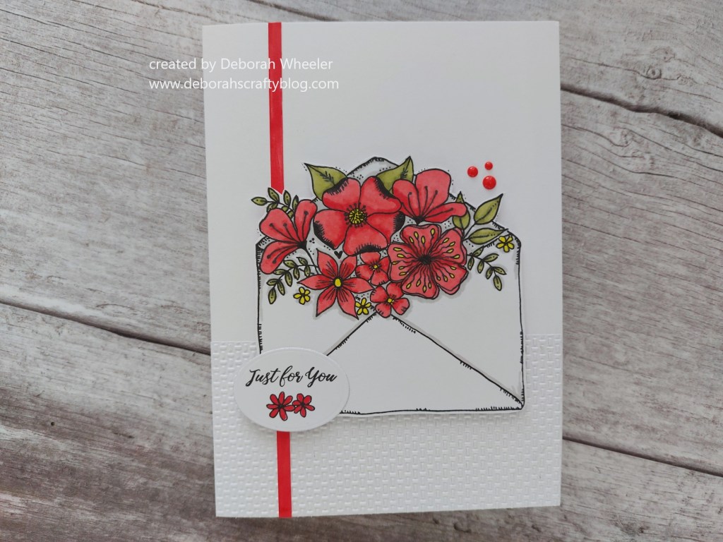 Hello crafty friends. I’m a bit late posting this evening (I’ve been out to dinner with a friend I haven’t seen for several years), but didn’t want to miss the opportunity to share this card that I’ve made with one of the brand new sets from Julie Hickey Designs that were only released on Friday! I’ve managed to blend four challenges into this card: the layout uses the sketch from Just Add Ink, together with the ‘layered’ theme from Addicted to CAS (not easy on a CAS card) and an embossed piece for Can You Handle The Pressure. I was also inspired by the beautiful red flowers in The Card Concept‘s photo.