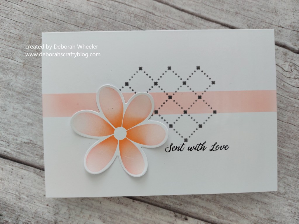 I started with an A6 card blank, masked a strip off across the centre with low tack tape and then blended ‘tattered rose’ Distress Oxide across it. I then laid the diamond weave pattern from Julie’s new ‘backgrounds 1’ stencil on the centre of the card, masked off the other parts of the stencil with sticky notes and sponged ‘black soot’ Distress Ink through it.