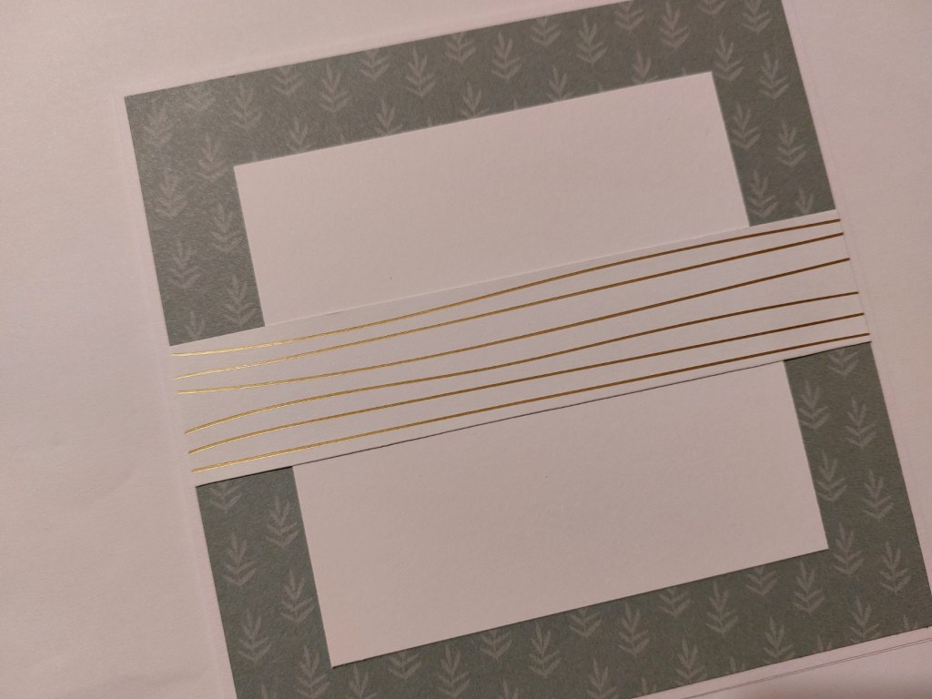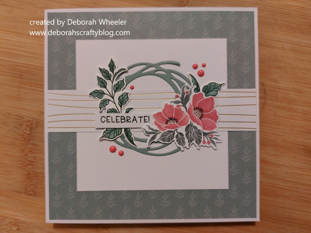 I started with a 6×6 square card and added a piece of the ‘fitting florets’ designer paper, with a square of white card on top and a strip of the gold striped paper from the last Saleabration.