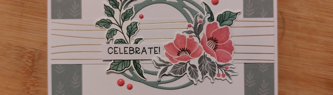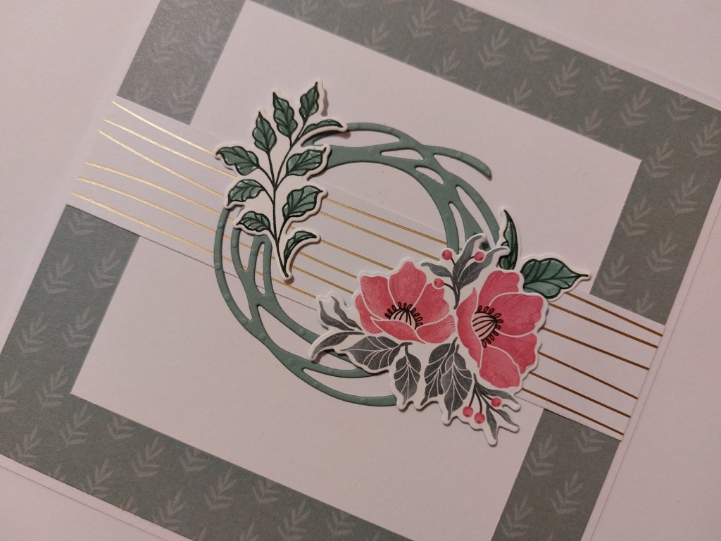 I cut the circle from the retired ‘swirly scribbles’ set in ‘soft succulent’ and glued it onto the card front. I then added a spray of flowers from the ‘fitting florets’ paper – I’d discovered that the co-ordinating dies cut this image out! I’d popped the flowers on a small scrap of card gluing to the card, which reinforced the paper and also lifted them slightly off the card, although not as high as a foam pad (great way to use up those little scrap pieces). I stamped a couple of leaves in ‘evening evergreen’, coloured them with the ink and a waterbrush and glued them behind the flowers, together with the leafy spray on the other side of the circle.
