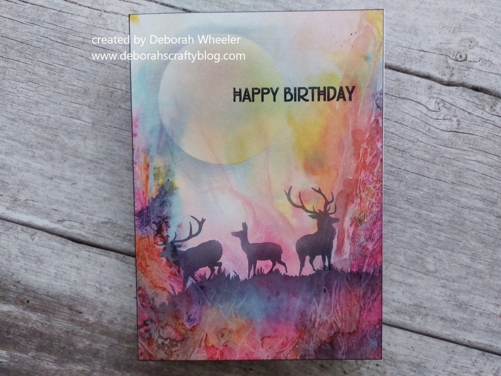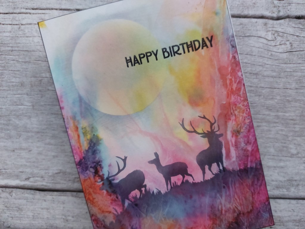I decided to go with some simple masking on a piece of Clarity’s glorious ‘Waimea Falls’ designer card. I ran a black Sharpie round the edge of the card to start with, then sponged black Archival ink across the hill from Clarity’s ‘deerscape’ mask set to pick the ground out.
