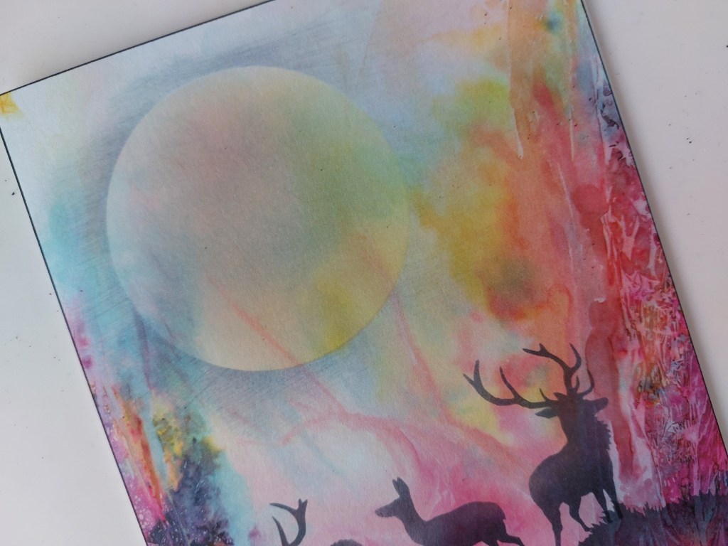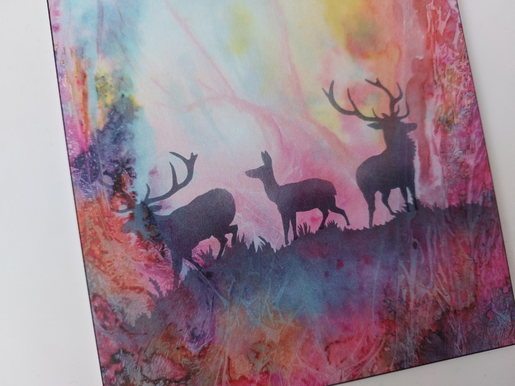 I then lined up the deer mask (which helpfully has a line on it to fit the hill). I masked off the two outer deer with tape and then sponged the black ink through the three central ones.