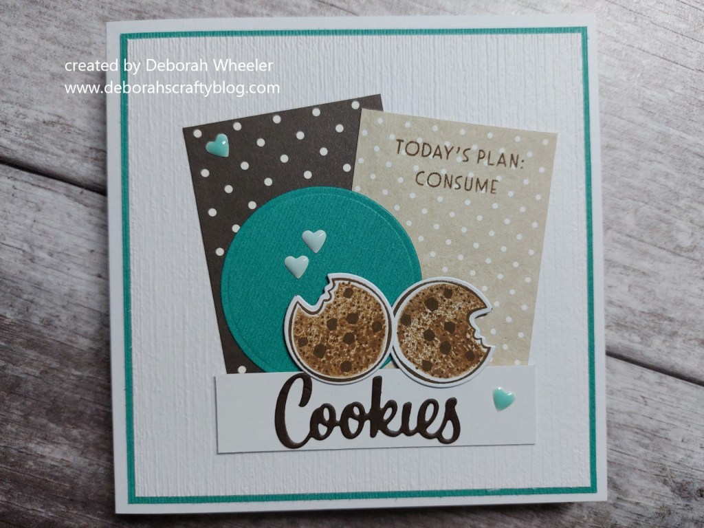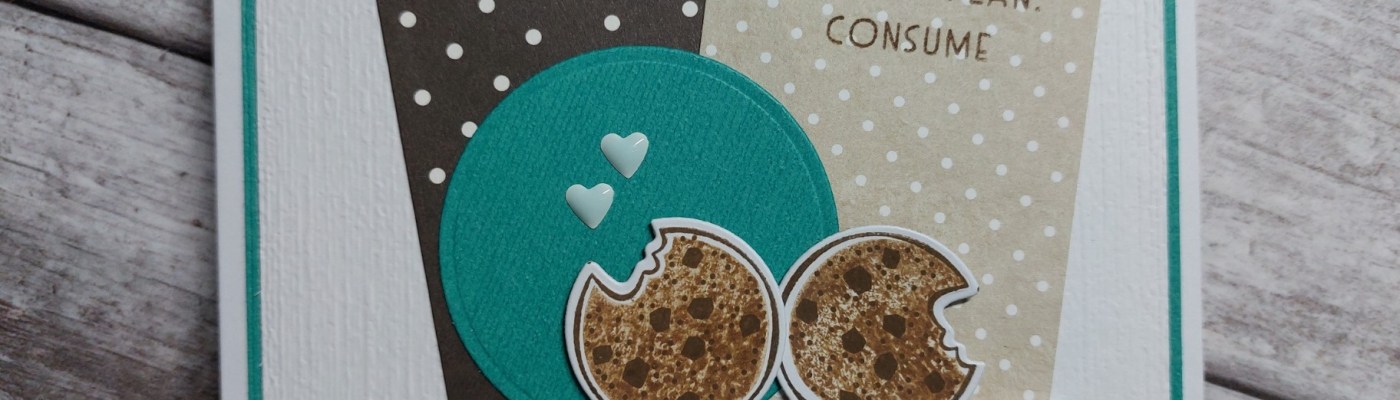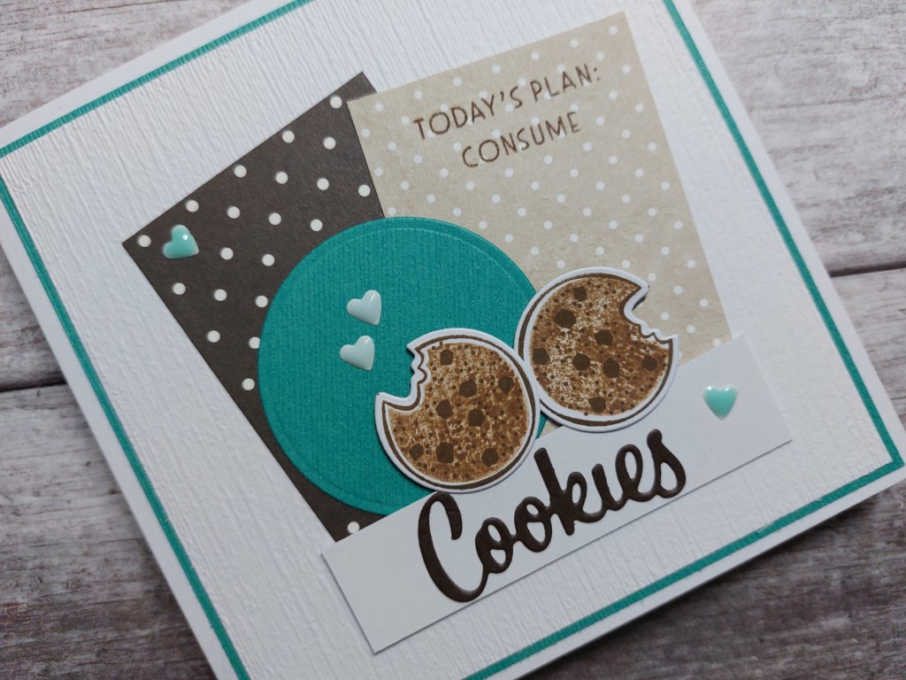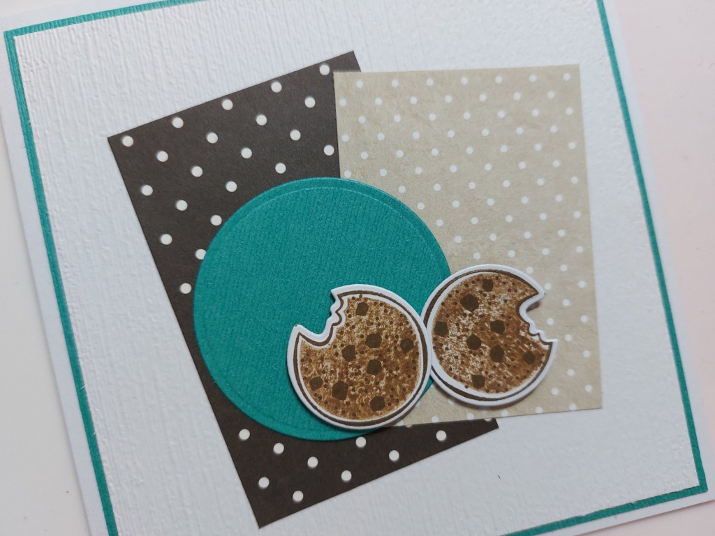 I die cut a circle in the teal card and glued that onto the front. I stamped the cookie from ‘nothing’s better than…’ twice, die cut them and attached to the card front with foam pads.