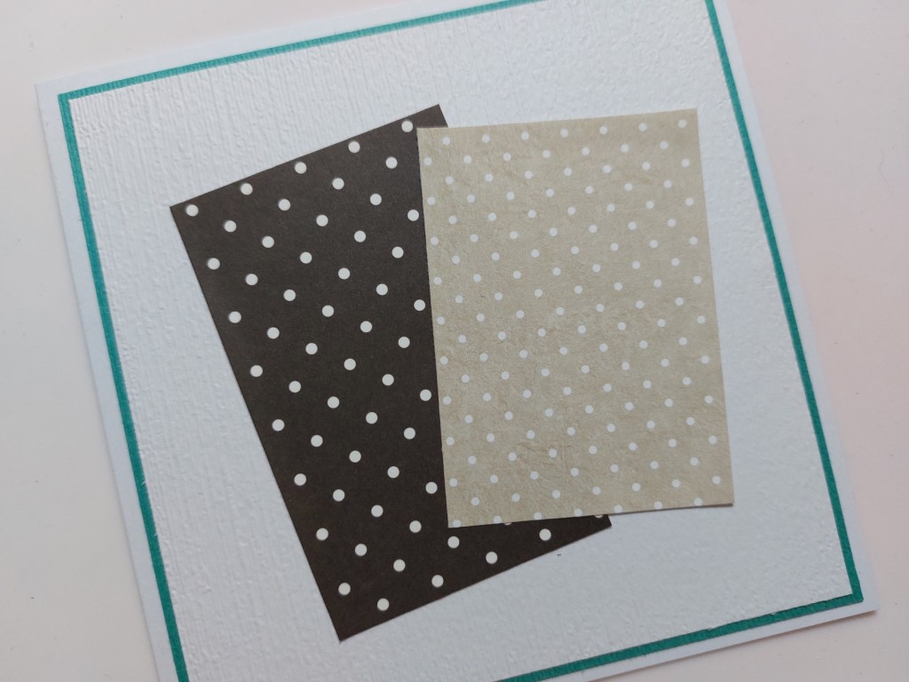 I started with a 5×5 card blank, adding layers of teal & white card to the front, after I’d embossed the white square using SU’s retired ‘subtles’ folder. I also added two pieces of dotty paper in browns (really old pieces buried in my stash!)