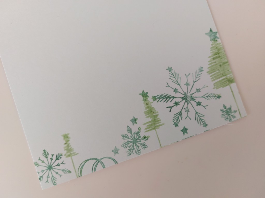 I started with a square of white card and used my stamping platform to stamp te border along the bottom edge in two colours. I first inked the snowflakes & stars using a SU Write marker in ‘mint macaron’ and stamped them into place. I then used a small Artistry inkpad in ‘dry weed’ to ink the trees, then re-stamped the image.