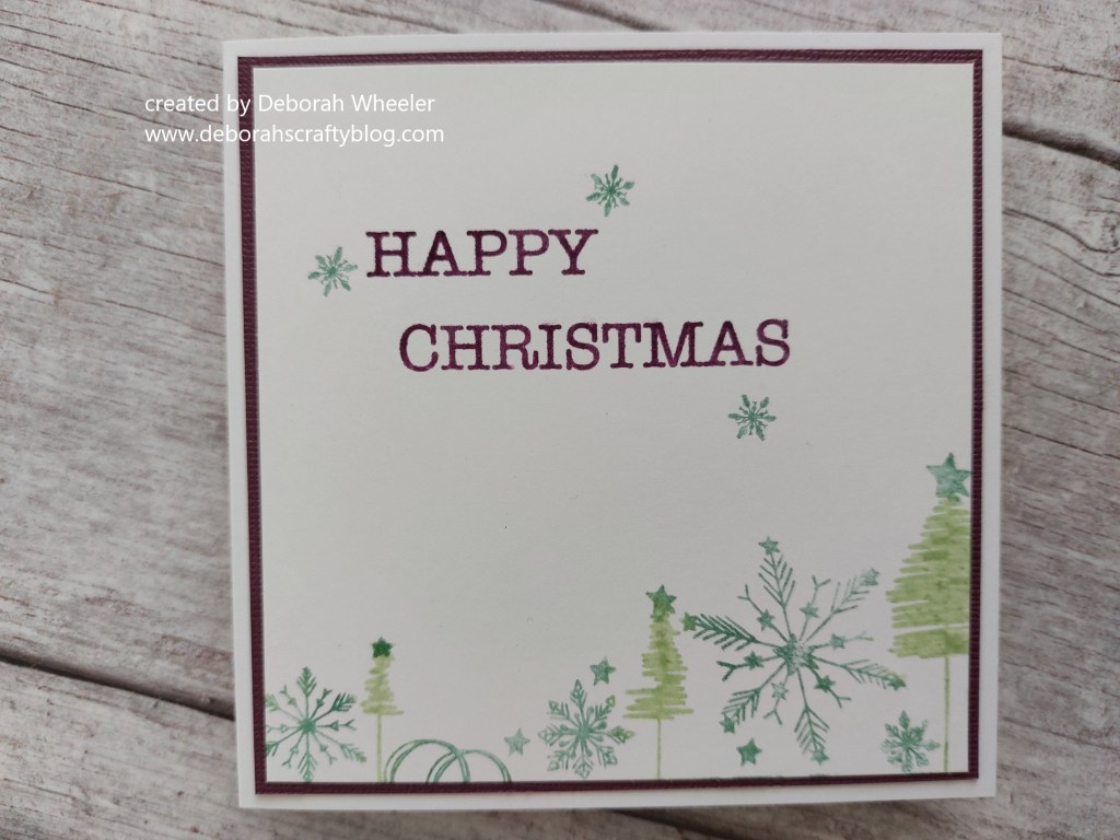 I mounted it on a layer of matching dark purple card and then onot a 5×5 card blank. I also retouched one of the stars on the trees with the mint pen, as it had got overstamped with the ‘dry weed’.