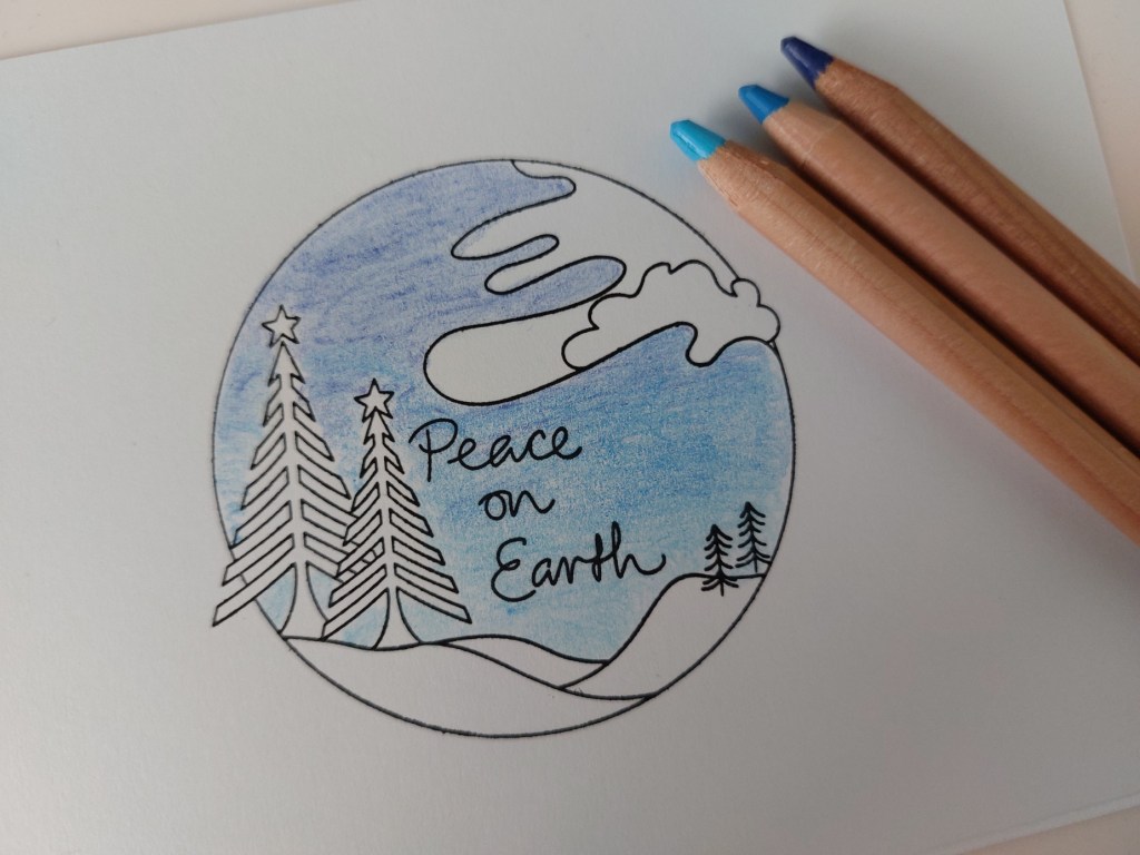 I started by stamping the globe onto a piece of white card and coloured the sky in with three shades of blue Pergaliner pencils.