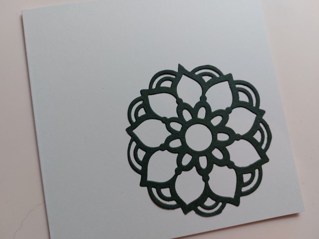 When I looked at it, I thought I could turn it into a poinsettia style design and get another Christmas card in the bag! I started by cutting it in dark green card, trimmed it out of the frame and glued it onto a 5×5 card blank.