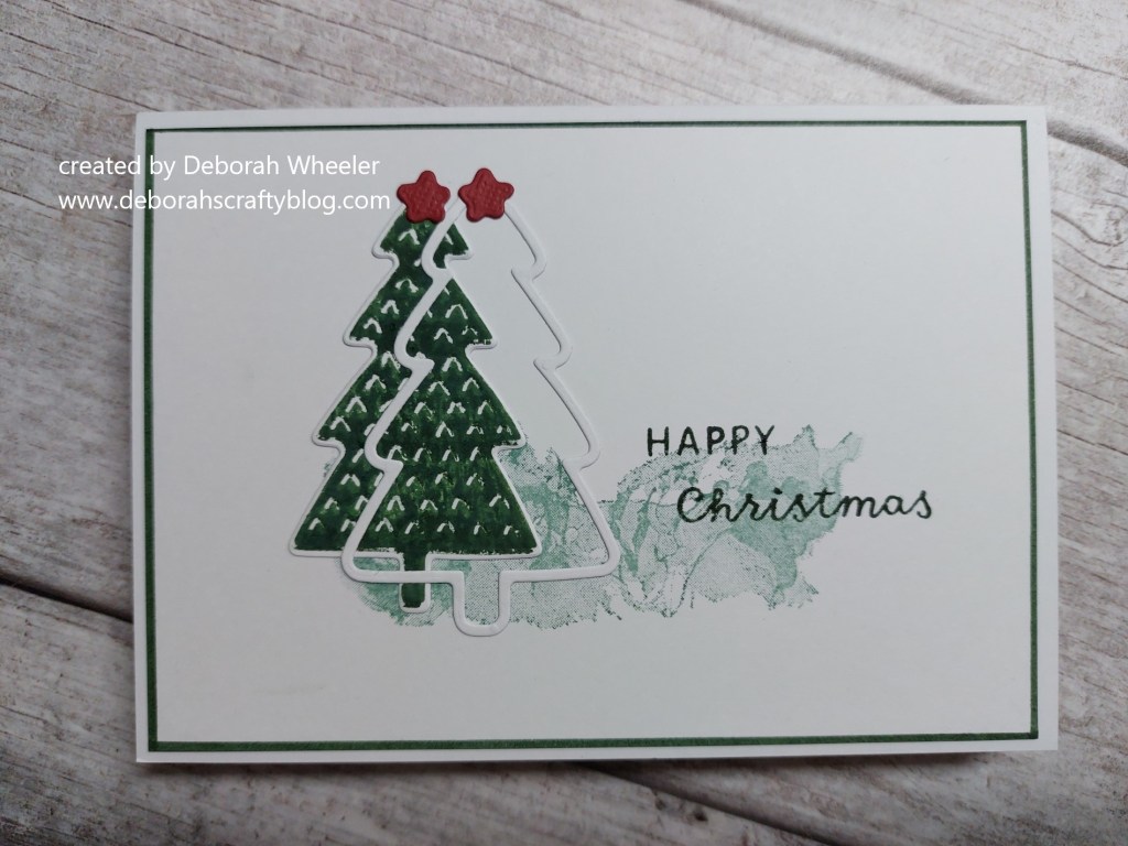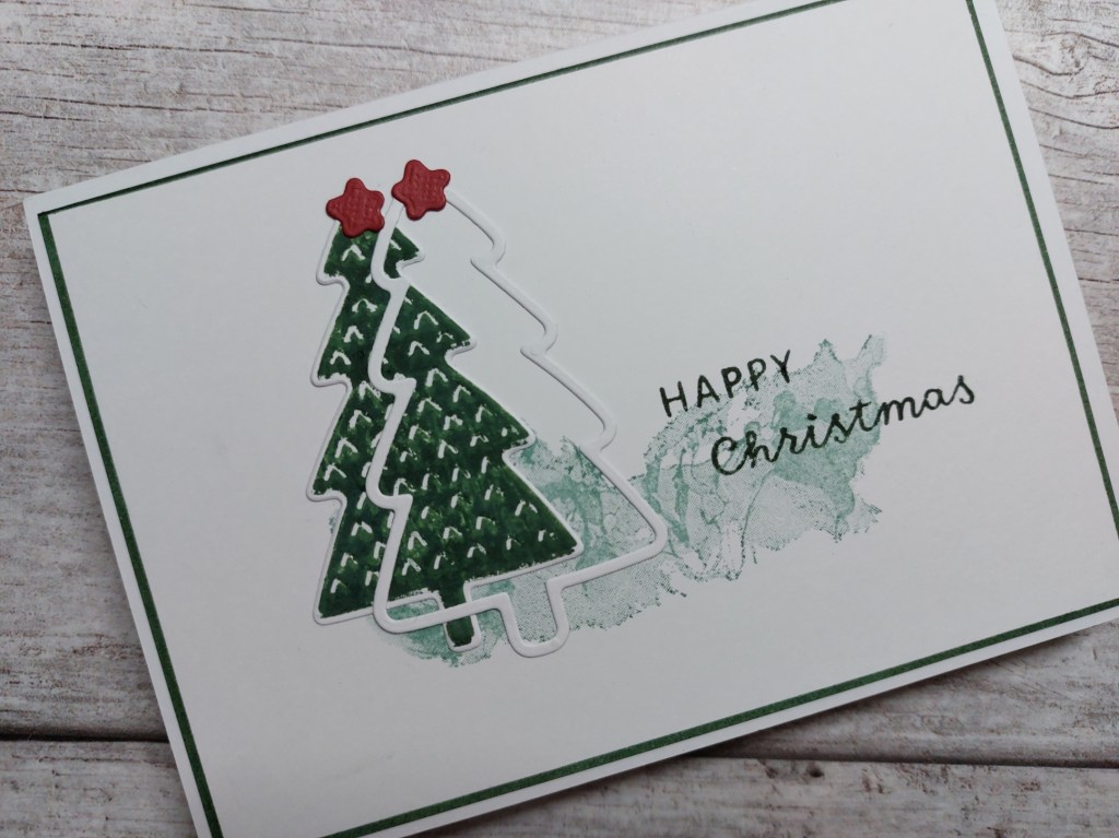I used a ruler and my ‘evening evergreen’ Write marker to draw a narrow border around the card, then attached it to an A6 card blank. I added the sentiment in ‘evening evergreen’ and finished with a couple of stars to top the trees, cut from the ‘spruced up outlines’ dies.