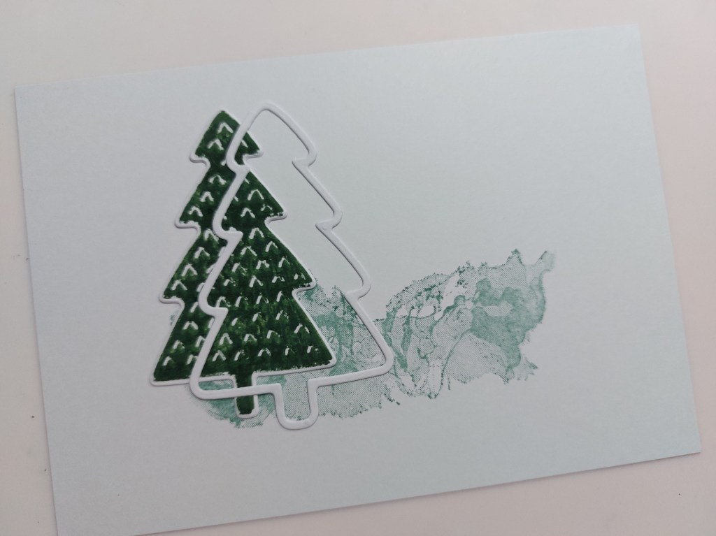 I stamped one of the trees from ‘spruced up’ in ‘evening evergreen’, then cut it out with the co-ordinating die. What I hadn’t fully realised was that the die cuts the tree outline as well as the image – a nice two-for-one! I was originally just going to use the stamped tree, but decided to overlay the outline die cut as well, for dimension.