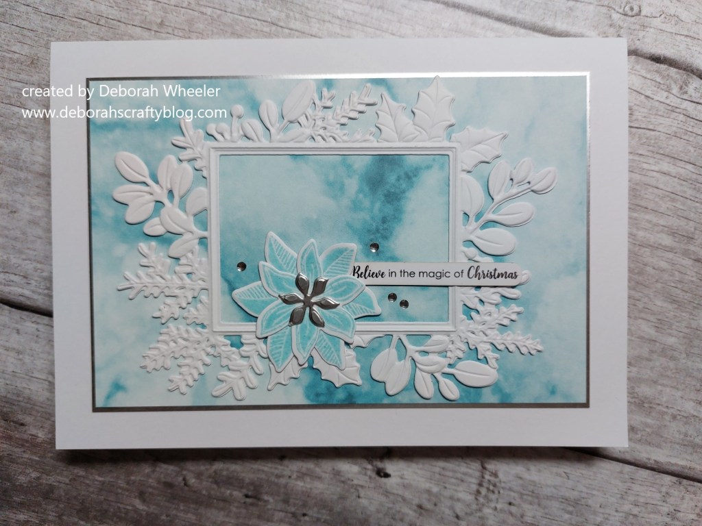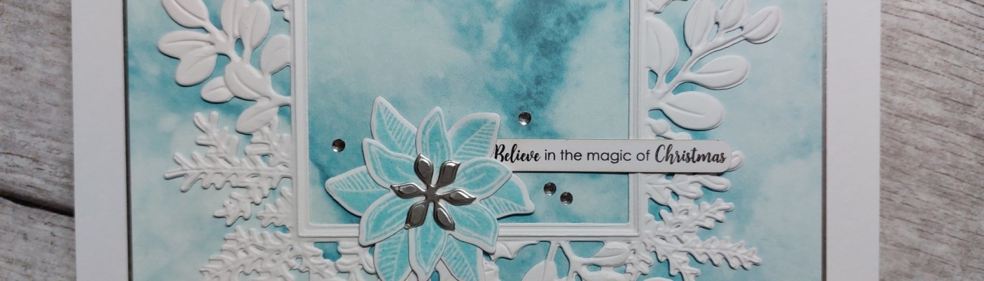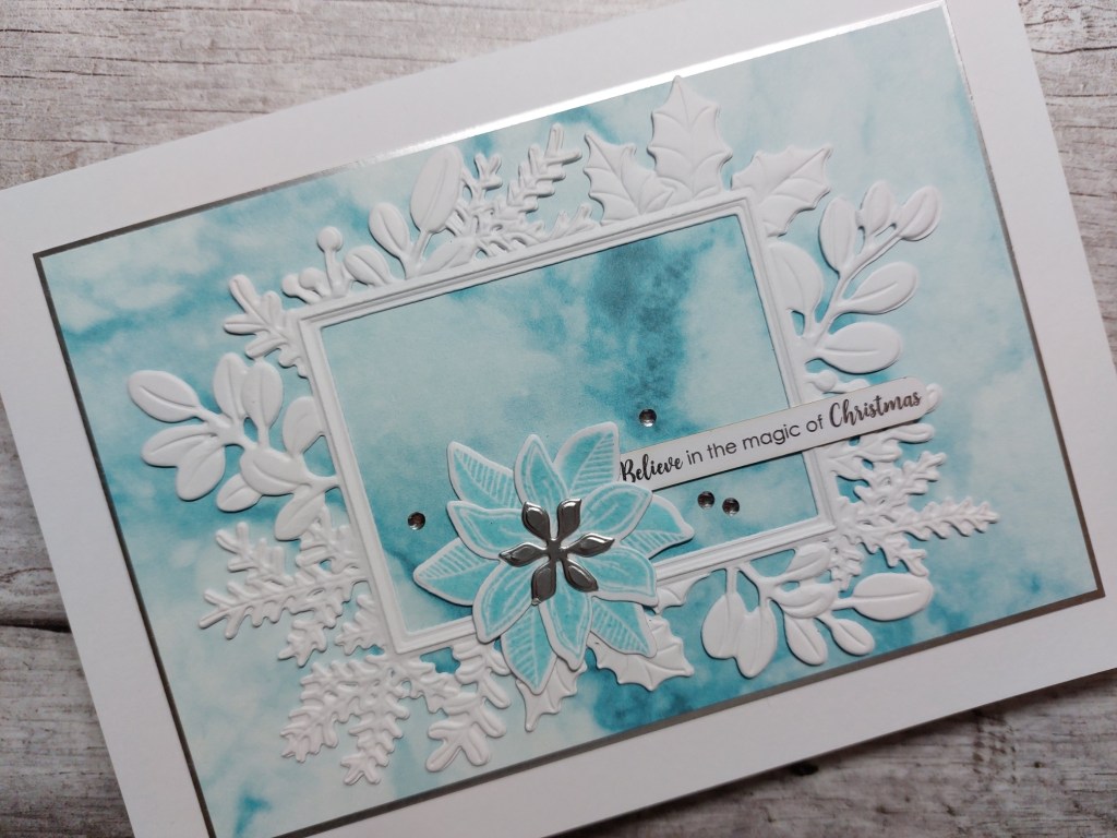 I stamped and die cut the poinsettia in ‘aqua fusion’ Artistry ink, added a silver centre and glued it to the card.