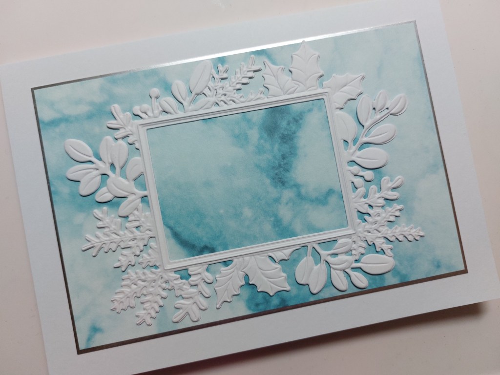 I started with a piece of the ‘simply marbleous’ paper from a previous Stampin’ Up! saleabration, mounted it on a layer of silver card and then onto a 5×7 card blank. I die cut the leafy frame from SU’s ‘merriest’ dies, then ran it through the co-ordinating embossing folder which gives it lovely dimension and glued it to the card front.