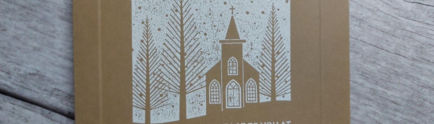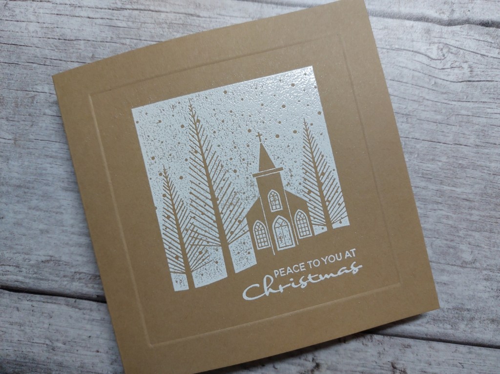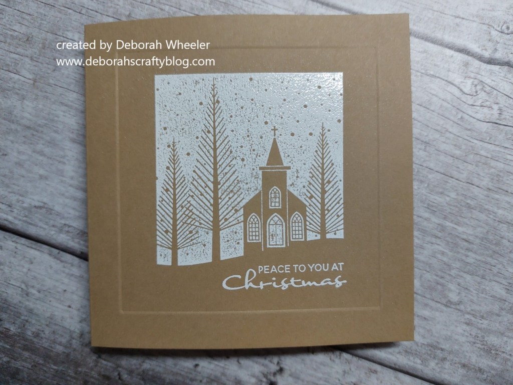 I heat embossed the church & trees, together with the sentiment, into the square frame using WOW’s superfine white powder. And that was it – didn’t need anything else!