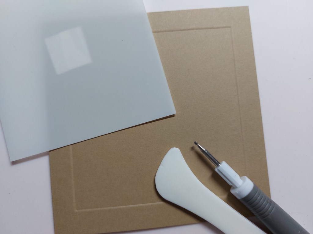I started with a 5×5 square kraft card blank (adaping the landscape layout from The Paper Players) and used one of Clarity’s embedders to create a frame. Just attached the embedder to the card front using a bit of low tack tape, flipped the card to the inside then ran a bone folder around to locate the edge of the embedder, finishing with an embossing tool to sharpen the line.